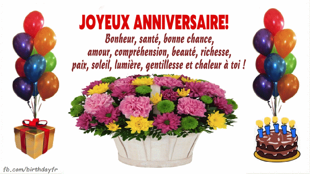 1)Joyeux anniversaire! Bonheur, santé, bonne chance, amour, compréhension, beauté, richesse, paix, soleil, lumière, gentillesse et chaleur à toi !